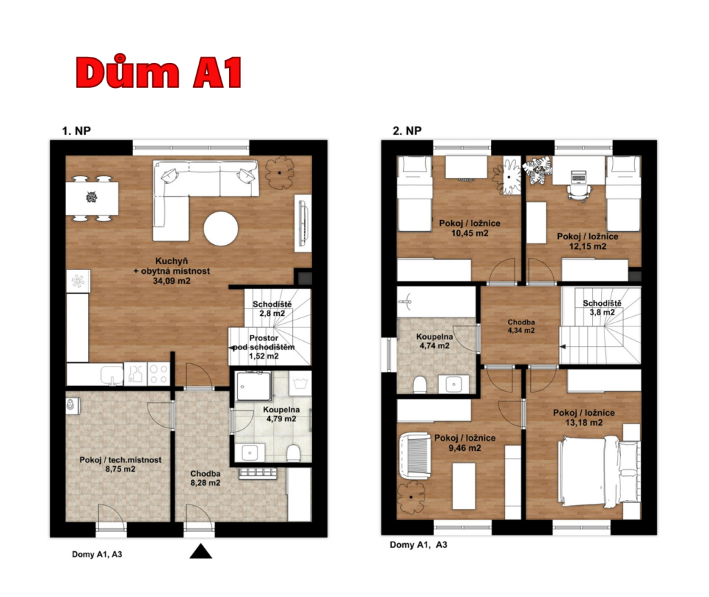 Dům A1 je krajový, díky tomu má navíc okno v koupelně v patře a také větší pozemek.